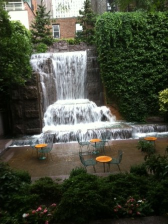 And there was another interesting bit of synchronicity. I had just started getting to know the second woman I spent a lot of time with last year, and we were texting and talking quite a bit, which added a lot of enjoyment to my explorations. Earlier, I’d teased her with the thought of us showering together in a waterfall. Now she was also on vacation and had just texted a photo of a small waterfall she’d come across, referencing the tease, when I looked up, on a busy NYC street, and saw a small park between the buildings with a lovely waterfall. Though hers was in the mountains and mine in the heart of a major metropolis, mine was bigger and more suited to erotic ablutions (aside from its public location). I ignored the sign saying photos weren’t allowed and texted a pic back to her.