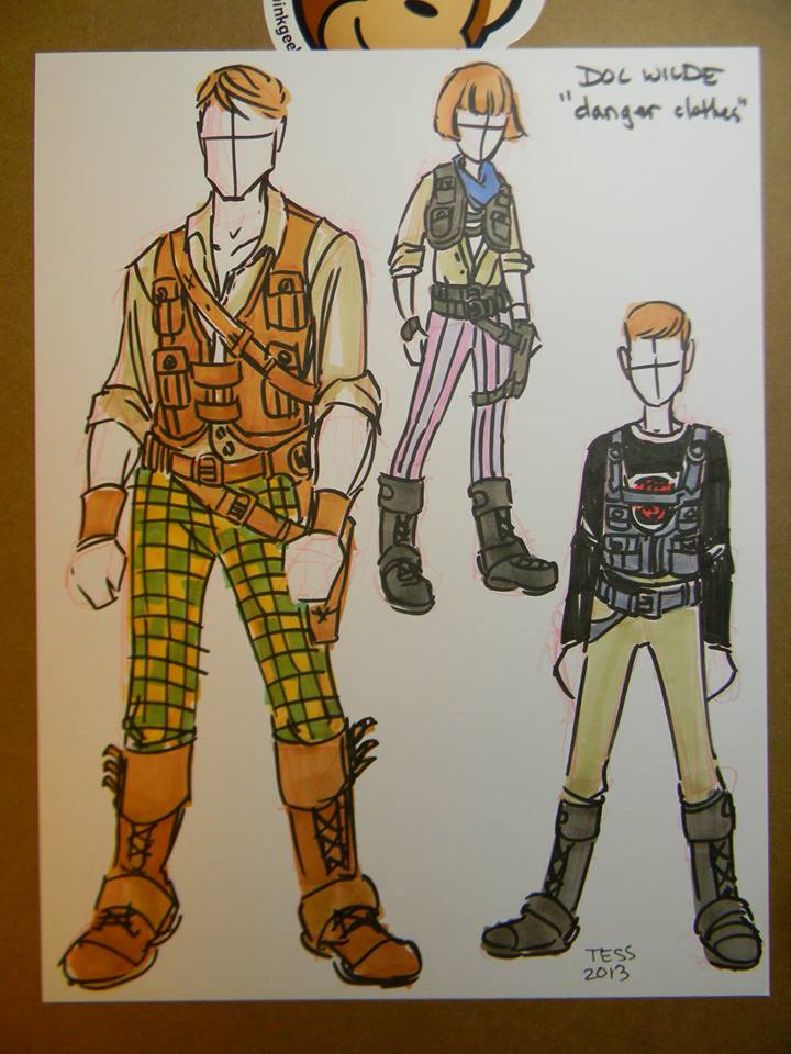 Tess sends a couple of initial character sketches. I say, “Looking awesome, Tess. :)” I give her a few notes, including “I prefer the topmost take on Doc, though each version seems a little long in the chin.”