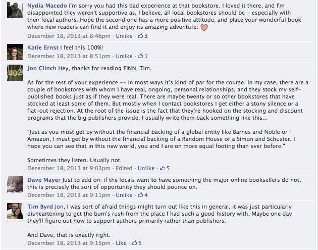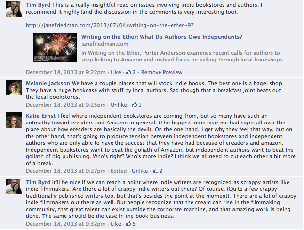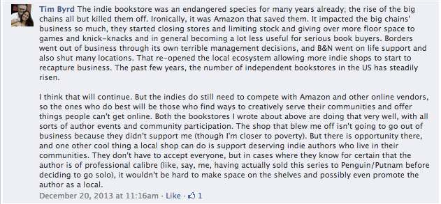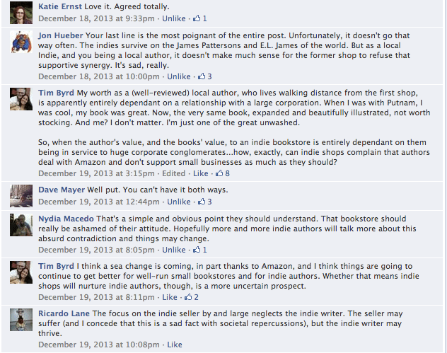 We hear a lot about how authors, and everyone else, should favor local, indie bookstores over Amazon and big chains. I love bookstores, especially cool little ones, and I even link to IndieBound on my site above Amazon, B&N, Smashwords, and other larger vendors.